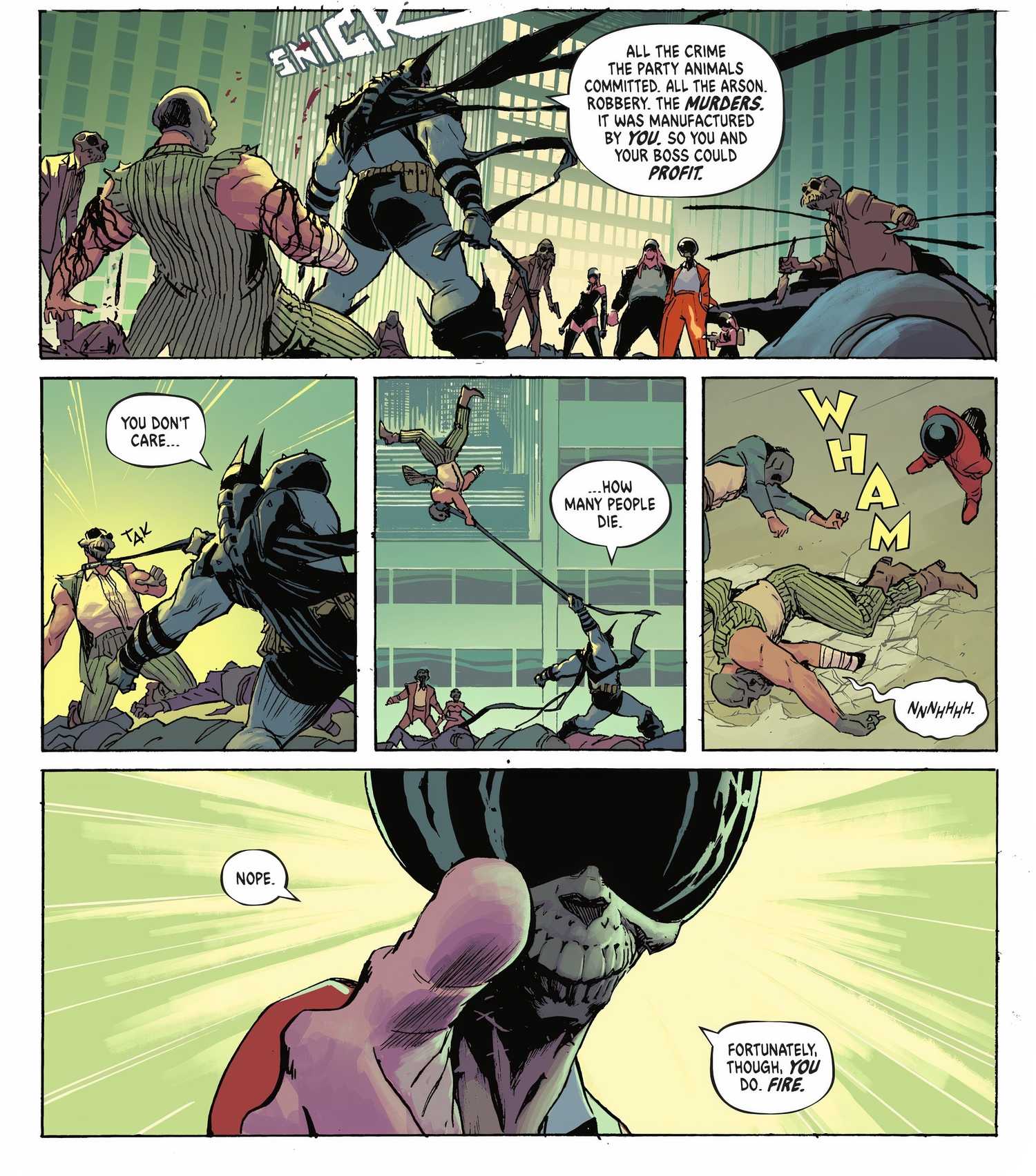 Batman absoluto #5 ve al Caballero Oscuro que se enfrenta a los animales del Partido de Black Mask, que lo abruman con números y armamento. Batman se mantiene de manera impresionante, incluso encontrando el enfoque para dar una conferencia a Sionis, diciendo: “Todo el crimen que cometieron los animales del partido. Todo el incendio provocado. Robo. Los asesinatos. Fue fabricado por usted. Entonces usted y su jefe podrían beneficiarse. No te importa … cuántas personas mueren “. La respuesta de Black Mask es tan escalofriante como reveladora: “No. Afortunadamente, sin embargo. Tú haces. Fuego.” El comando de Sionis de disparar se dirige a los francotiradores colocados en los tejados, que comienzan a matar a los animales del partido en el suelo.