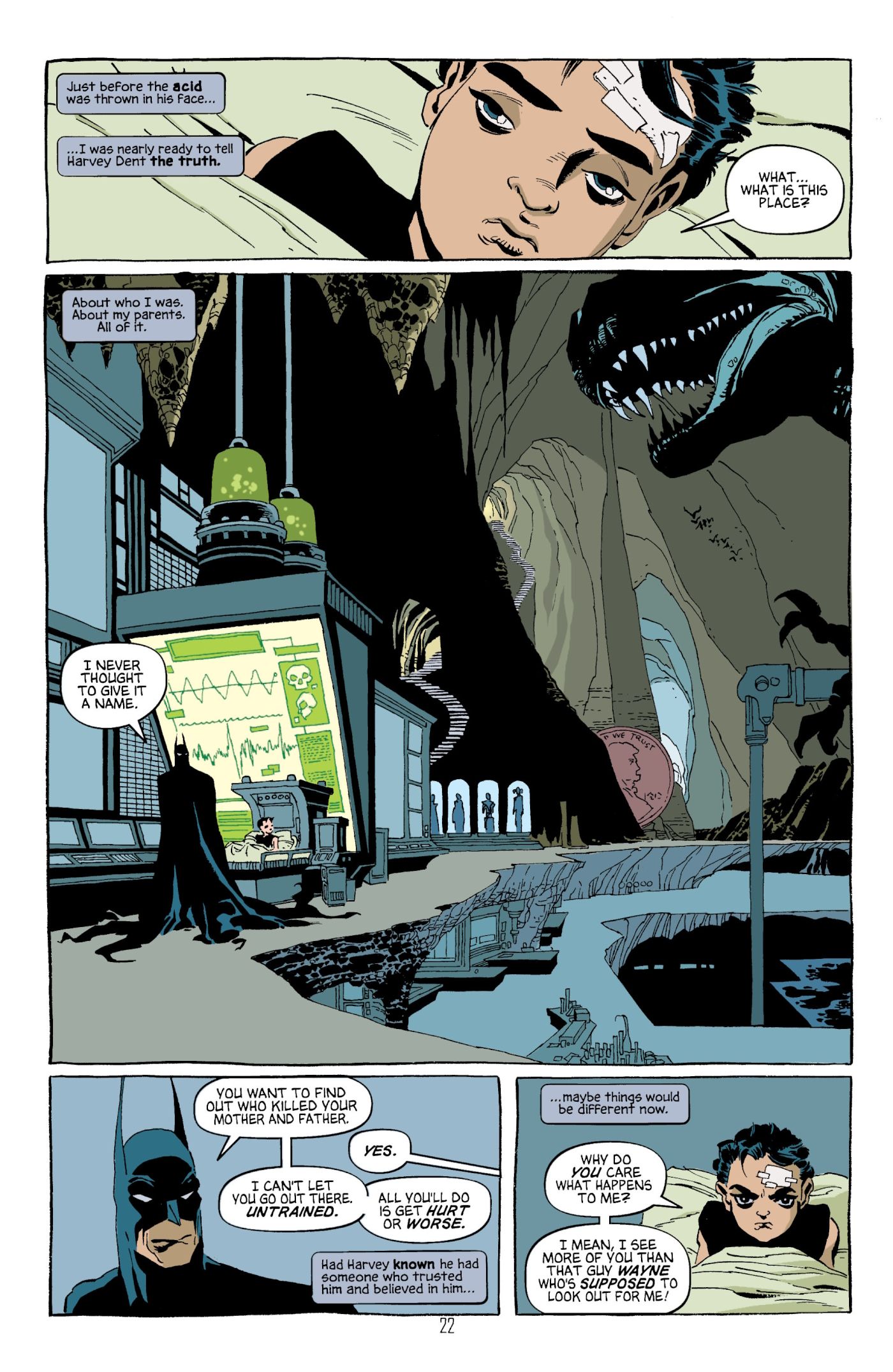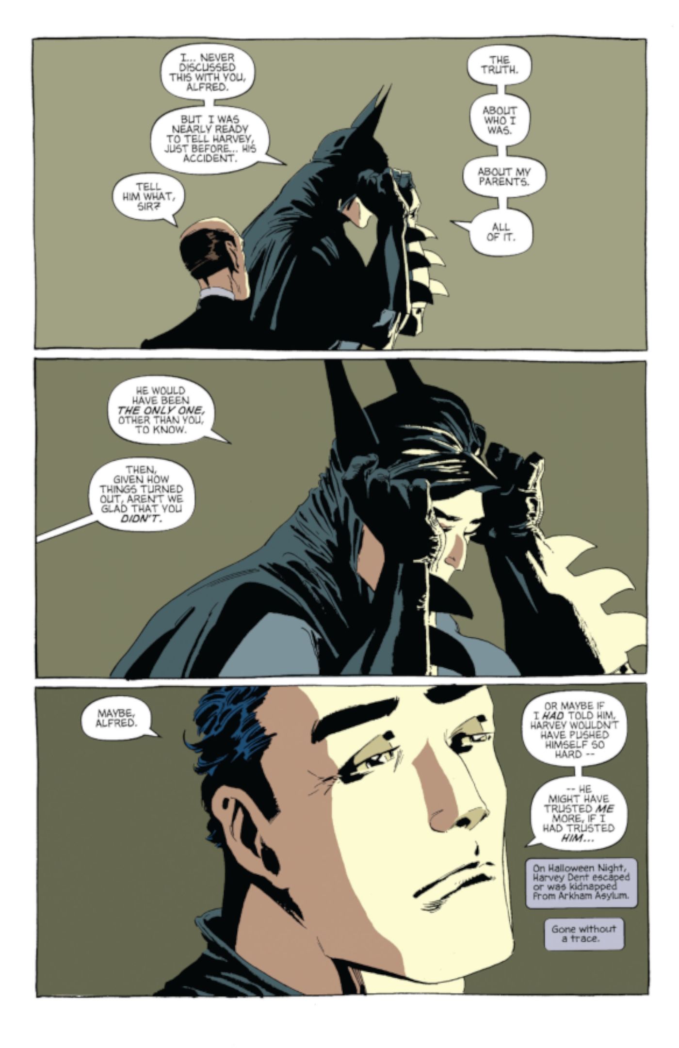 Aquí, Batman decide desenmascararse, convirtiendo a Dick Grayson en la segunda persona en conocer la verdadera identidad de Batman, aunque ese no siempre fue el plan. Batman admite durante su monólogo interior que la segunda persona con la que realmente quería compartir su secreto era Harvey Dent, lo que se volvió imposible cuando se transformó en Dos Caras.