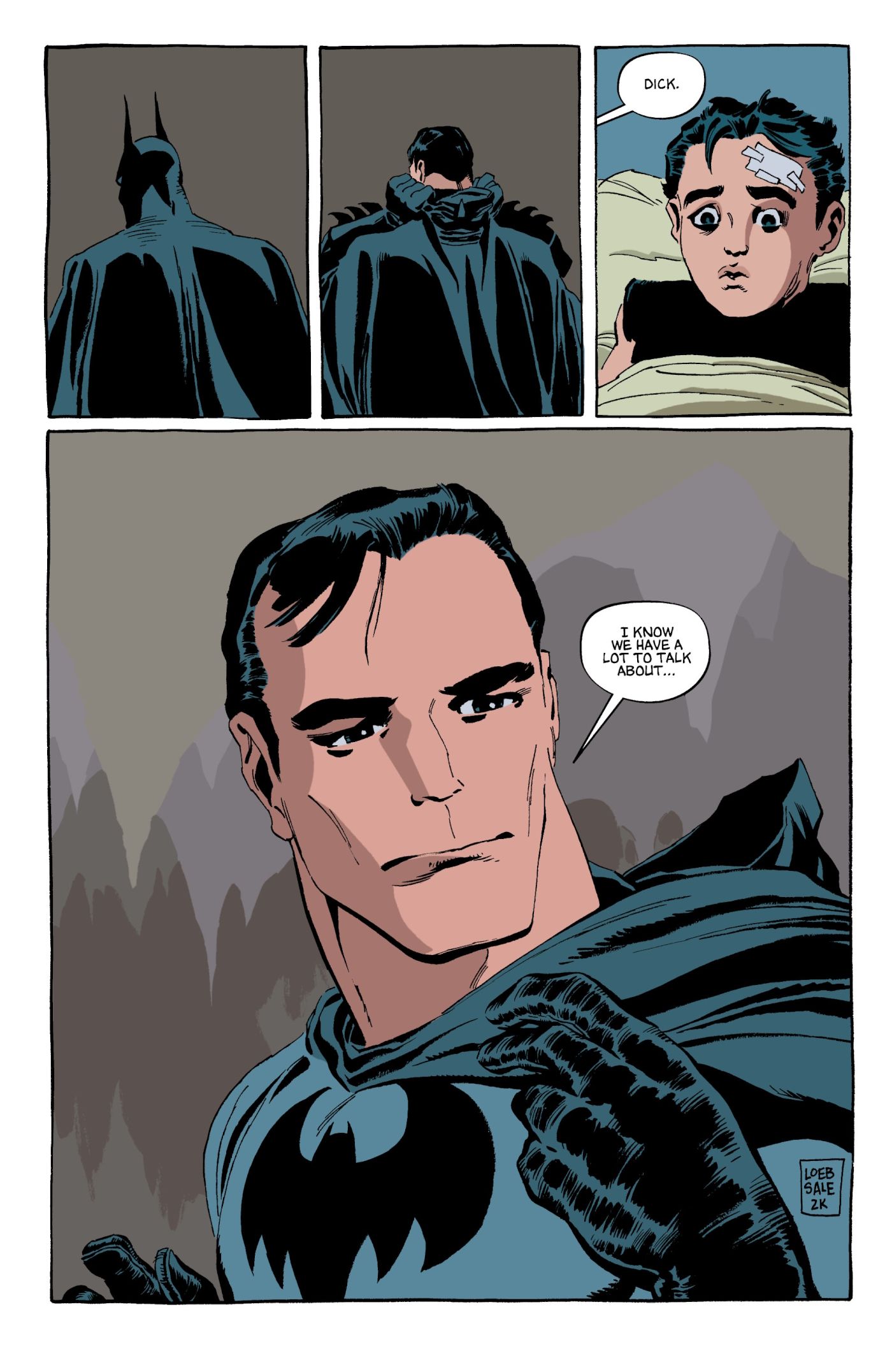 Batman: Victoria oscura # 10, de Jeph Loeb, Tim Sale, Richard Starkings y Gregory Weigh, presenta al Caped Crusader revelando su identidad a un joven Dick Grayson. Después de que el niño resulta herido al intentar encontrar a los hombres que mataron a sus padres, Batman lo lleva de regreso a la Baticueva.
