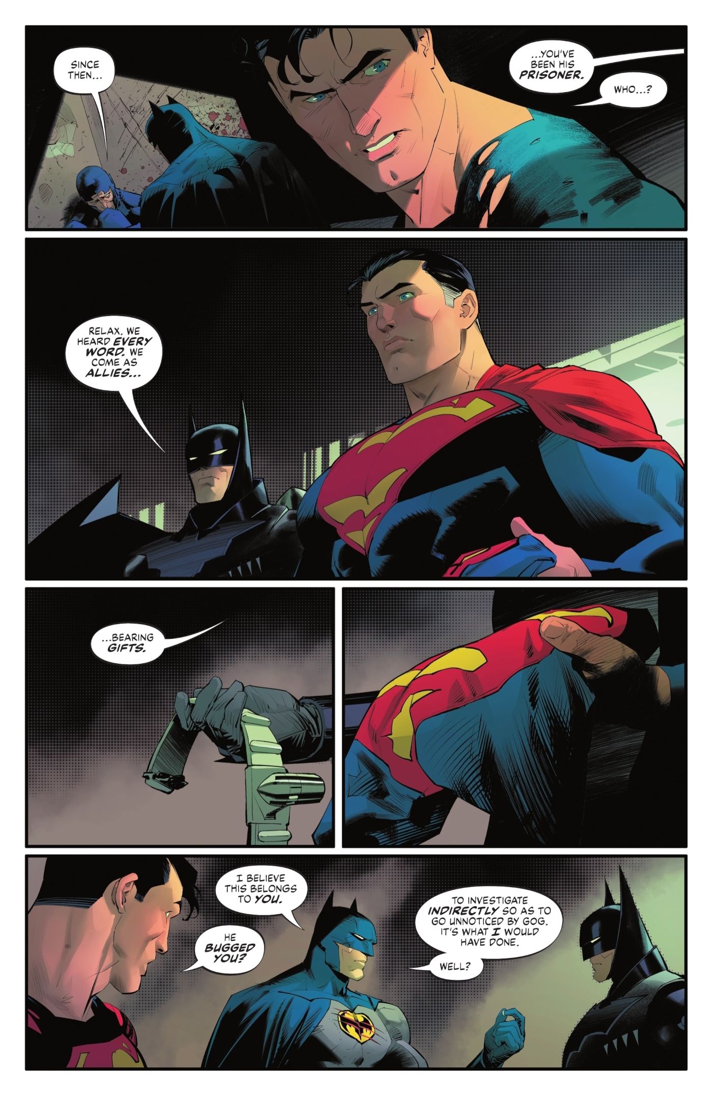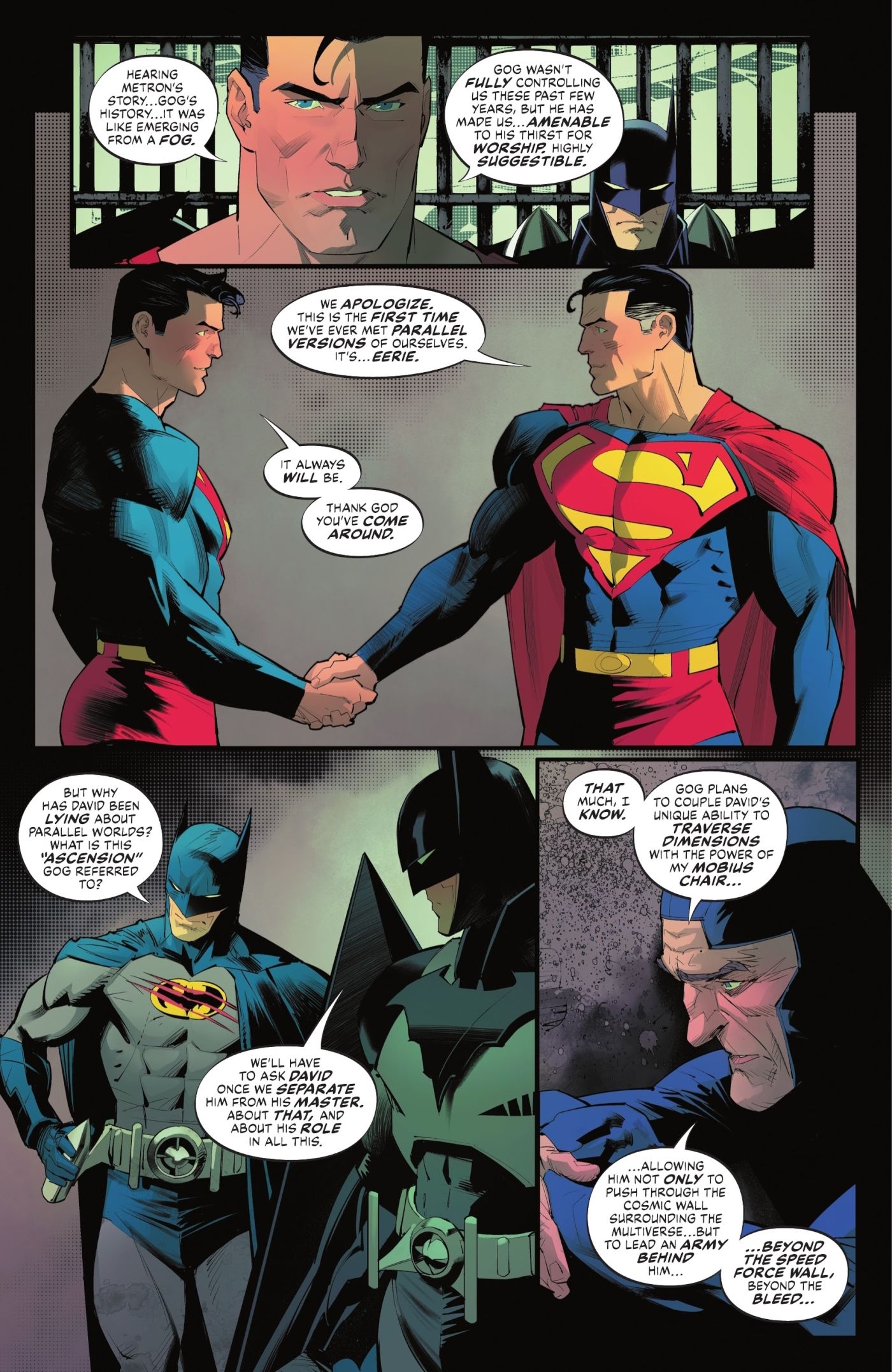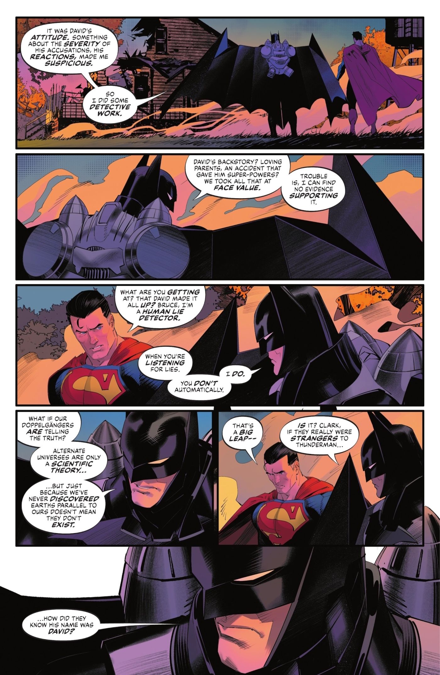 Venga el reino Batman deduce que Batman y Superman de Tierra-0 parecen estar diciendo la verdad sobre su situación. Superman afirma que es un detector de mentiras viviente y que se habría dado cuenta si estuvieran diciendo la verdad. Batman no está de acuerdo y afirma que, si bien Superman puede sentir las mentiras, es solo cuando las escucha activamente, y Batman siempre está escuchando las mentiras.