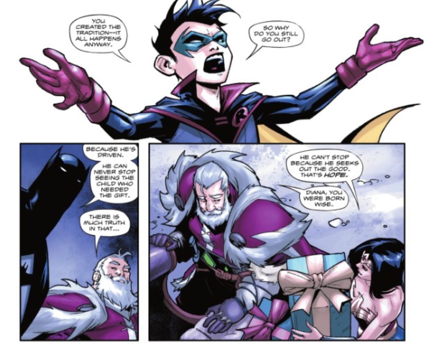 Pero en lugar de que Santa respondiera la pregunta de Damian, Batman, Wonder Woman y Superman ofrecen sus propias explicaciones de por qué Santa continúa entregando regalos. Sin embargo, Las respuestas de la Trinidad ahondan sin darse cuenta en sus propias razones para seguir siendo héroes.a pesar de “tradición” de proteger a las personas continuaría sin ellas a través de las acciones de otros héroes.