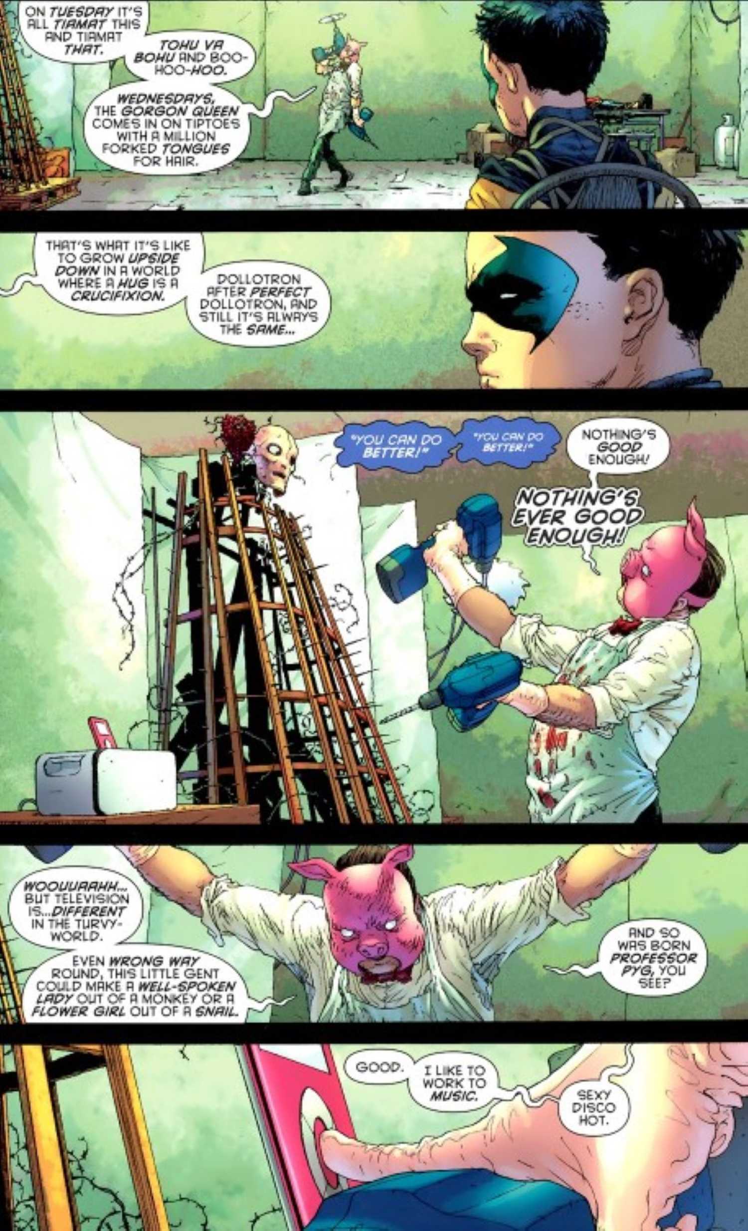 No se puede negar que Morrison realmente desarrolló al profesor Pyg de una manera increíble. Sin embargo, el problema con este intrincado trasfondo es que solo unos pocos lectores de cómics son conscientes de ello, como se revela en el epílogo y no en la narrativa misma. Debido a esto, la mayoría de los lectores no tienen esta perspectiva cuando ven al villanolo que hace que sus motivaciones parezcan planas y poco desarrolladas. Sin embargo, aunque soy consciente de estos antecedentes, todavía encuentro que esta versión del profesor Pyg es demasiado repugnante para ser considerada un “buen personaje”.