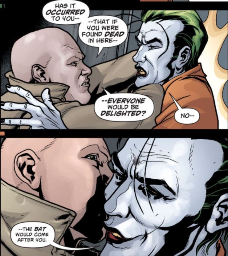 El Joker no tiene motivos para temer a nadie gracias a Batman. Un breve encuentro con Lex Luthor muestra cómo Joker usa a Batman como su propia amenaza personal.