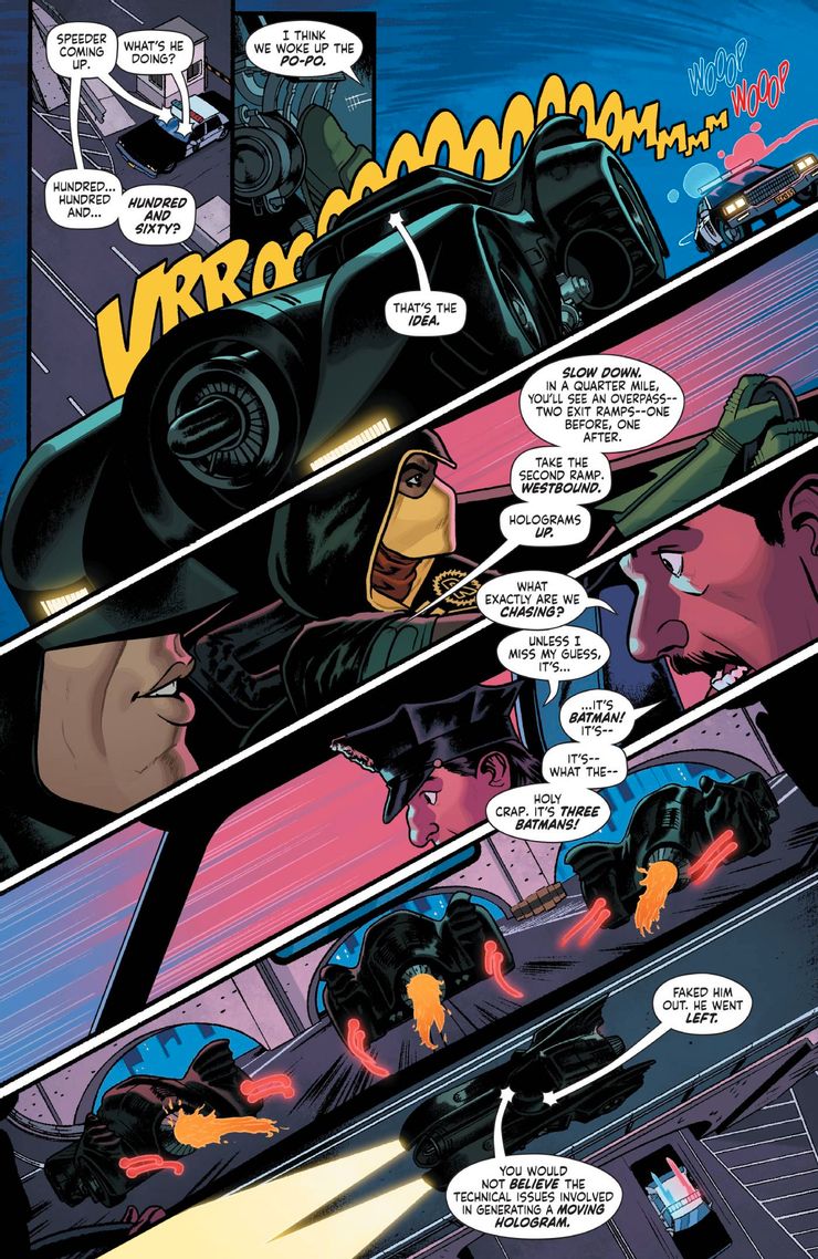 Sin embargo, podría percibirse como una pista de que la página inmediatamente siguiente muestra al Caballero de la Noche conduciendo el Batimóvil en una persecución policial. Utiliza dos Batimóviles holográficos para deshacerse del GCPD, que representan a tres Batmen distintos. Esto podría ser un guiño a los tres miembros de la familia de murciélagos que aparecen en el número, incluidos Batman, Robin y Barbara, insinuando su Bati-chica destino. batman ’89 # 5 Estreno el martes 12 de abril.