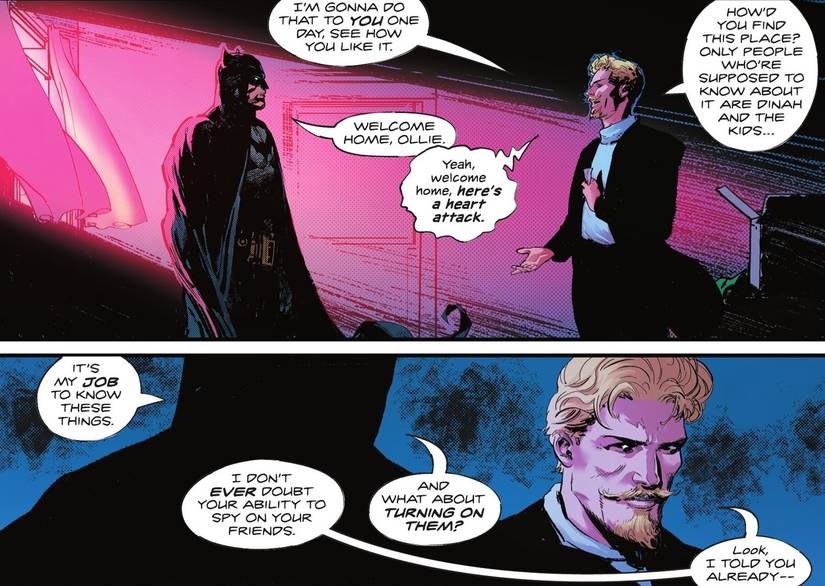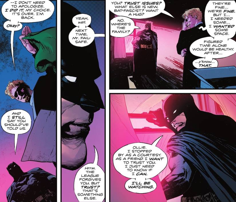 Batman se esfuerza por decirle a Oliver que debería haberle contado a la Liga sus planes, mientras Oliver le recuerda a Bruce que nunca le contó a nadie sobre su sistema Failsafe estilo Batman.su peligroso robot anti-Liga de la Justicia que acabó sirviendo a Waller. Batman concluye este encuentro notando la diferencia entre el perdón y la confianza, y le dice a Oliver que estará observando.
