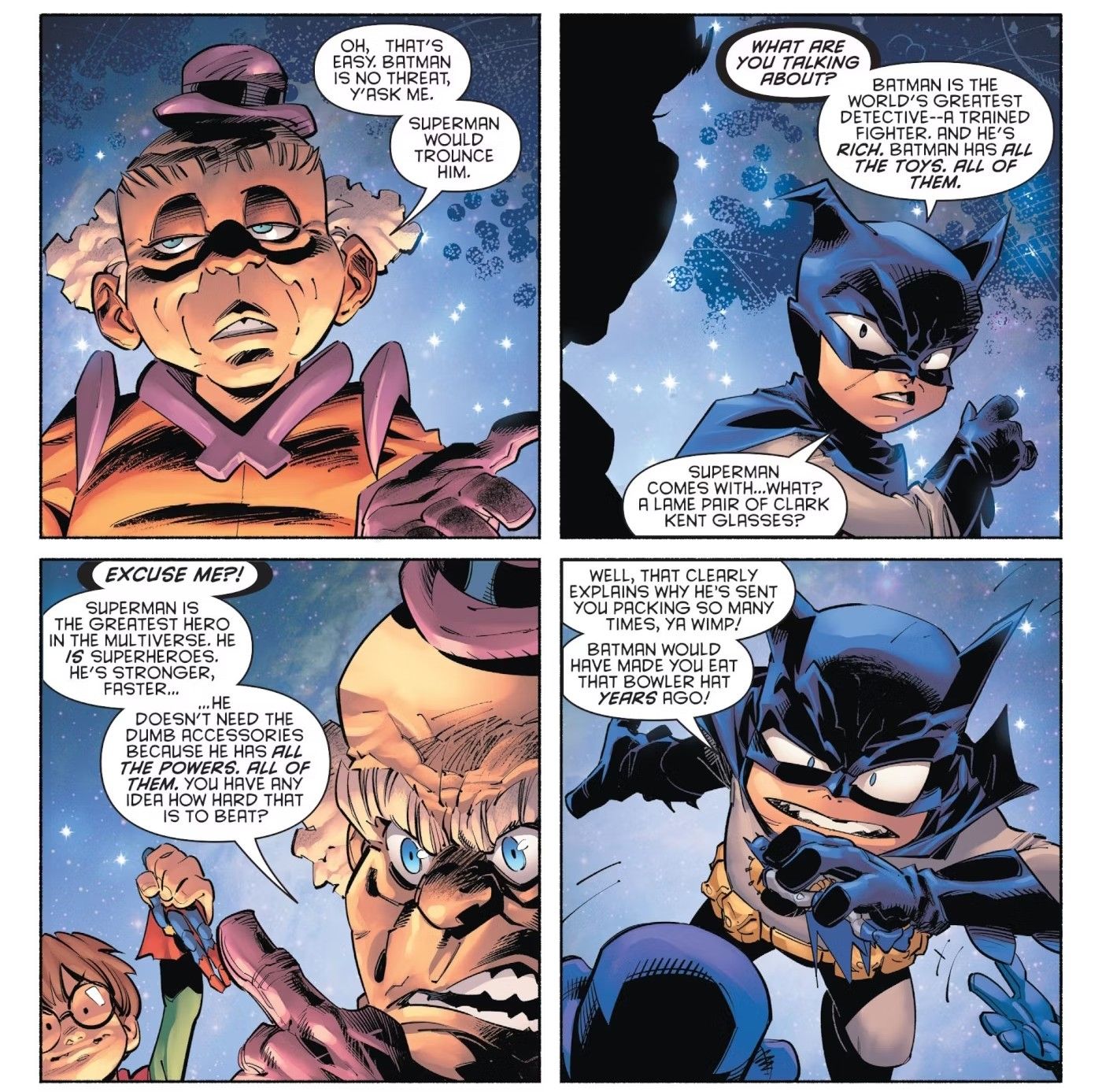 - Batman señala que Mxyzptlk y Bat-Mite tuvieron que crear escenarios intrincados para hacer que Batman y Superman pelearan, mostrando su renuencia a luchar entre sí.