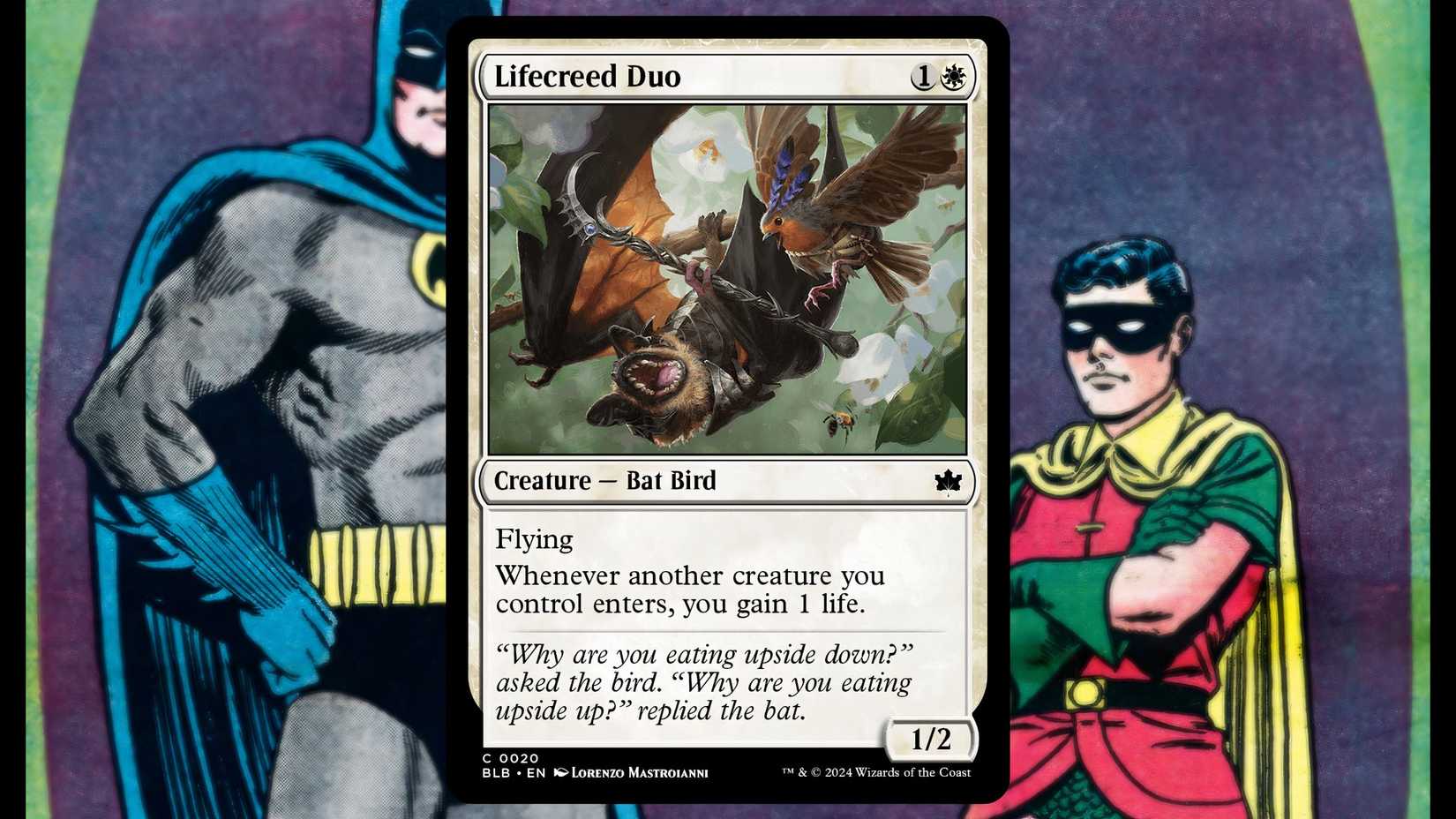 Hay que reconocer que el cameo de Batman y Robin en esta colección es en gran medida fortuito. Hay cinco colores de cartas en Magia: el encuentro (Blanco, Azul, Negro, Rojo y Verde), y en la expansión “Bloomburrow”, cada par de colores está representado por una especie animal característica. Las cartas “Duo” como “Lifecreed Duo” muestran dónde se cruzan esos emparejamientos, con los animales blancos y negros (murciélagos) formando equipo con los animales blancos y azules (pájaros). Sin embargo, La elección deliberada del artista de hacer del pájaro en cuestión un petirrojo convierte una pareja fortuita en un homenaje explícito.