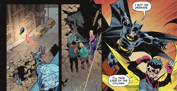 Esto trae las cosas a Petirrojo #13 de Joshua Williamson y Roger Cruz. Sirviendo como el cuarto capítulo de Guerra de las sombras, Batman encuentra a su hijo confrontando a Deathstroke en una azotea junto con la hija de Slade Wilson, Ravager, y su nuevo hijo Respawn, que se revela como el descendiente secreto de Slade y Talia (lo que lo convierte en el medio hermano de Damian). Después de que Deathstroke revelara que había sido incriminado, Slade arrojó una granada a un grupo de transeúntes cercanos para que él y sus hijos pudieran escapar. No dispuestos a dejar que se pierdan vidas inocentes, Batman y Robin inmediatamente se pusieron en acción, marcando el regreso oficial del Dúo Dinámico que ha estado ausente durante mucho tiempo de las páginas actuales de DC Comics.