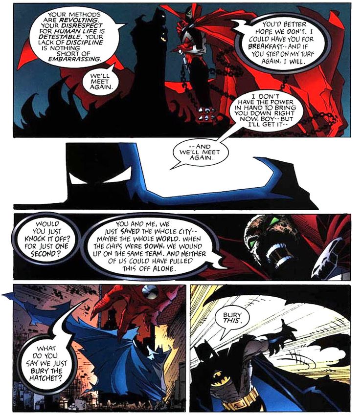 Los dos personajes funcionan muy bien juntos. Ambos tienen una conexión con el lado oscuro y ambos intentan mantenerlo bajo control. Sin embargo, Spawn tiene un código moral mucho más flexible en comparación con Batman y no tiene problemas para matar. Después de casi 30 años, ¿habrá cambiado la dinámica entre los dos para reflejar la evolución de ambos personajes durante el mismo tiempo?