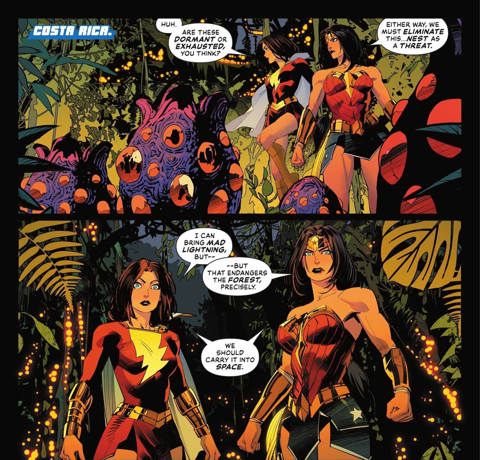 Entonces, cuando Mary Marvel y Wonder Woman se unieron en Liga de la Justicia Ilimitada #2, estaba eufórico al ver a dos de mis favoritos trabajando juntos, y mi emoción fue más que recompensada. Mis expectativas quedaron completamente destrozadas cuando Waid y Mora los establecieron como un equipo de ensueño absoluto en una sola página de diálogo y arte. Mientras las dos heroínas piensan en cómo manejar un nido de Parademon, terminan sin problemas las oraciones del otro antes de llegar simultáneamente a la misma conclusión: “Deberíamos llevarlo al espacio”. Para dos personajes que rara vez trabajan juntos, su nivel de sincronía supera incluso la icónica asociación de Batman y Superman, aventurándose en la dinámica rara y perfectamente sincronizada de Batman y Robin.