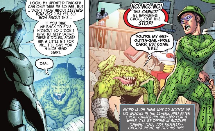 Batwing también sabe cuándo luchar y cuándo intentar razonar. Cuando comienza a enfrentarse a Killer Croc, Batwing intenta apelar al (limitado) sentido de la razón del villano de que dejan de luchar y Luke puede concentrarse en aprehender a Riddler. El mismo Batman en numerosas ocasiones ha razonado con éxito y, en raras ocasiones, ha rehabilitado a ciertos villanos, como cuando Clayface se unió brevemente a la lista de aliados de Batman durante el Noche de los hombres monstruo arco escrito por Tom King y Steve Orlando con arte de Riley Rossmo. Luke en Batman: Urban Legends # 4 intenta razonar con Croc, y finalmente lo logra, siguiendo el ejemplo de Batman de que la violencia no siempre es el mejor camino para resolver una situación. Los lectores aún tienen que ver esto con el próximo Batman de Tim Fox, lo que solidifica aún más que Luke estaba bien preparado para asumir el papel y las responsabilidades de ser el Caballero de la noche de Gotham.
