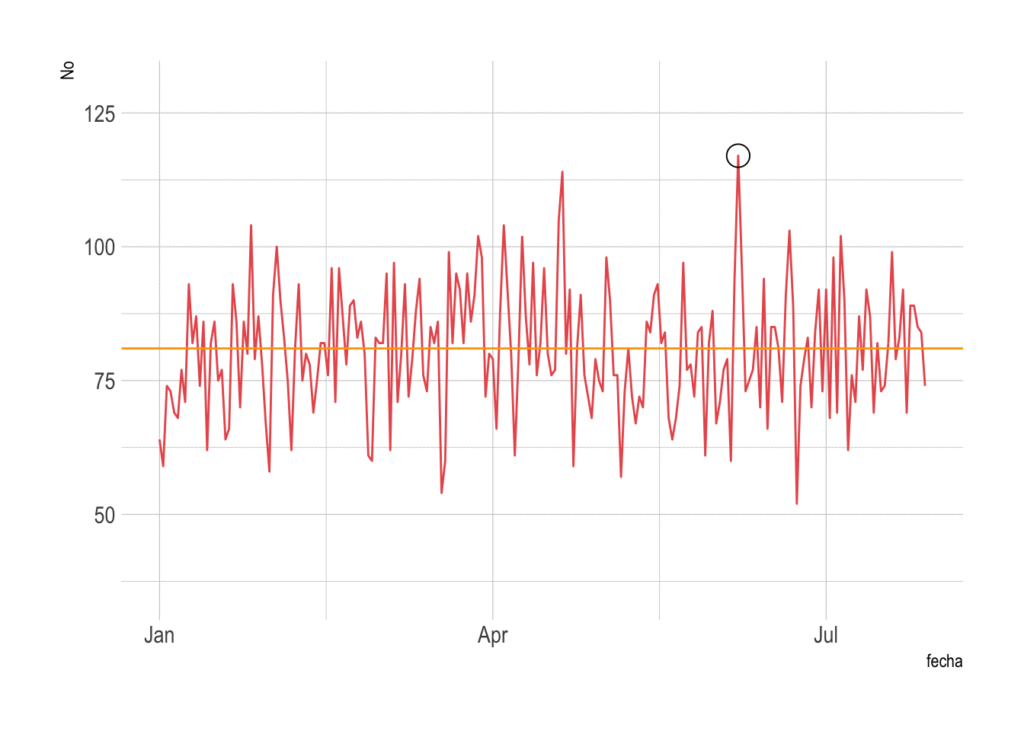 El círculo indica el día con más casos hasta ahora: es el 7 de junio con 117 casos: