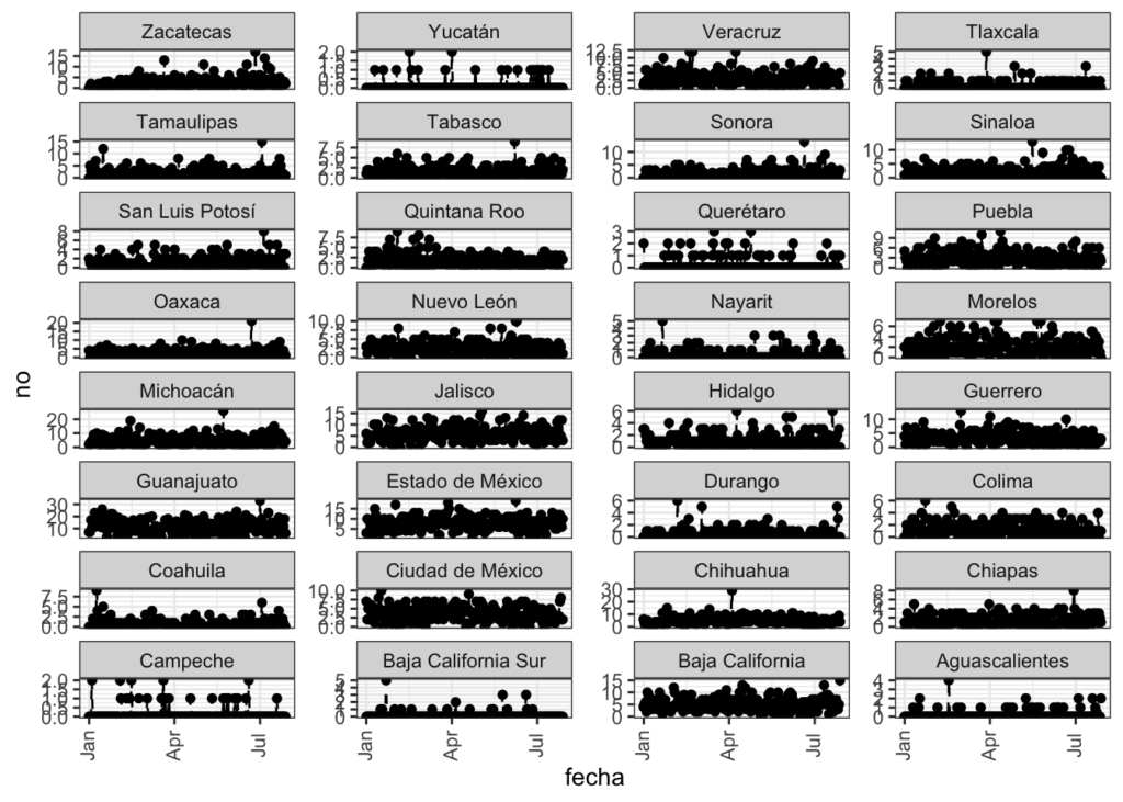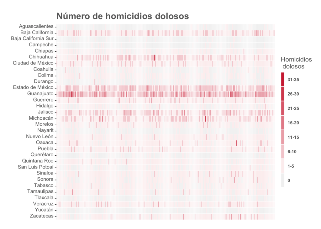 En el siguiente gráfico, cada día está representado por un rectángulo que se colorea de gris a rojo, dependiendo del número de homicidios registrado por día en cada entidad: