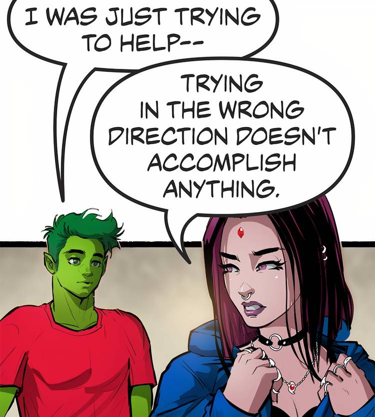Este romance de los titanes llega a su mayor obstáculo hasta ahora en Renacimiento de Raven #1, cuando Raven parece abajo en los vertederos y el niño de la bestia intenta levantar el espíritu de su novia con bromas. Sin embargo, Raven le atribuye sus esfuerzos y revela que ella está lidiando con el aniversario de la muerte de su madre. Él comete su segundo error al afirmar que apenas habla de su madre, ya que Trigon es una amenaza recurrente para los Titanes, mientras que la madre de Raven “Acabo de morir”. Frustrado por la pobre frase de Beast Boy, Raven se apaga, lo que lo lleva a ser desplazada a Galonia.