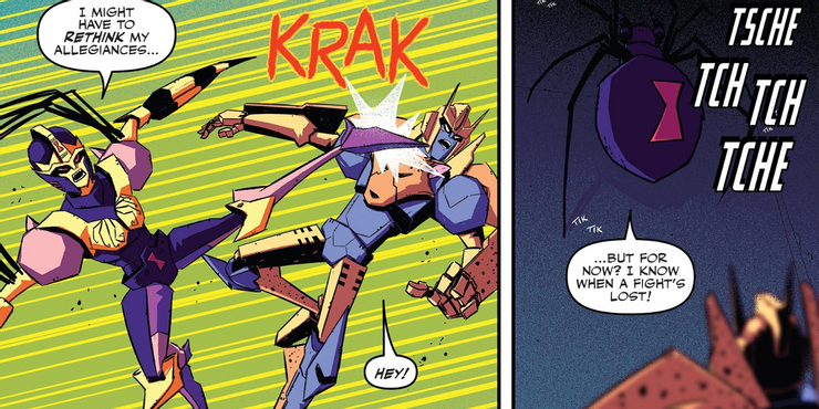 Pero durante la batalla épica de tres números del cómic, Blackarachnia hace una afirmación sorprendente que su contraparte de la televisión nunca habría sugerido. Al escuchar en el enlace de comunicación de su oponente Cheetor que Optimus Primal derrotó a Megatron, Blackarachnia dice que podría tener que reconsiderar sus lealtades en Transformadores: Guerras de bestias #12 por el escritor Erik Burnham, el artista Josh Burcham y el rotulista Jake M. Wood. Por supuesto, esto no es suficiente para hacer que se pase a los Maximals en este mismo momento como su antiguo aliado de Predacon, Dinobot. En cambio, patea a Cheetor al suelo para que pueda escapar en su forma de araña viuda negra mientras dice: “¿Pero por ahora? Sé cuando una pelea está perdida.“