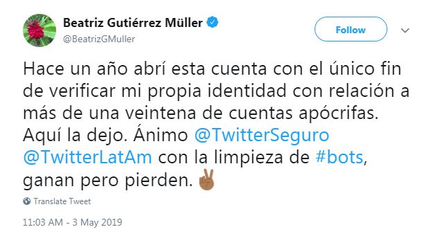 “Aquí la dejo. Ánimo @TwitterSeguro @TwitterLatAm con la limpieza de #bots, ganan pero pierden”, escribió Gutiérrez Müller en lo que sería su último mensaje en esta plataforma digital.