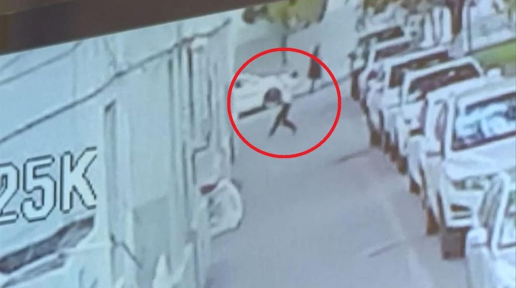 En las imágenes de las cámaras de seguridad se observa cuando Turghanbek se baja de su vehículo y estira los brazos para atrapar al niño. El pequeño da el primer golpe amortiguador en sus manos y luego su cuerpecito cae al suelo. Ambos quedaron inconscientes por unos minutos.