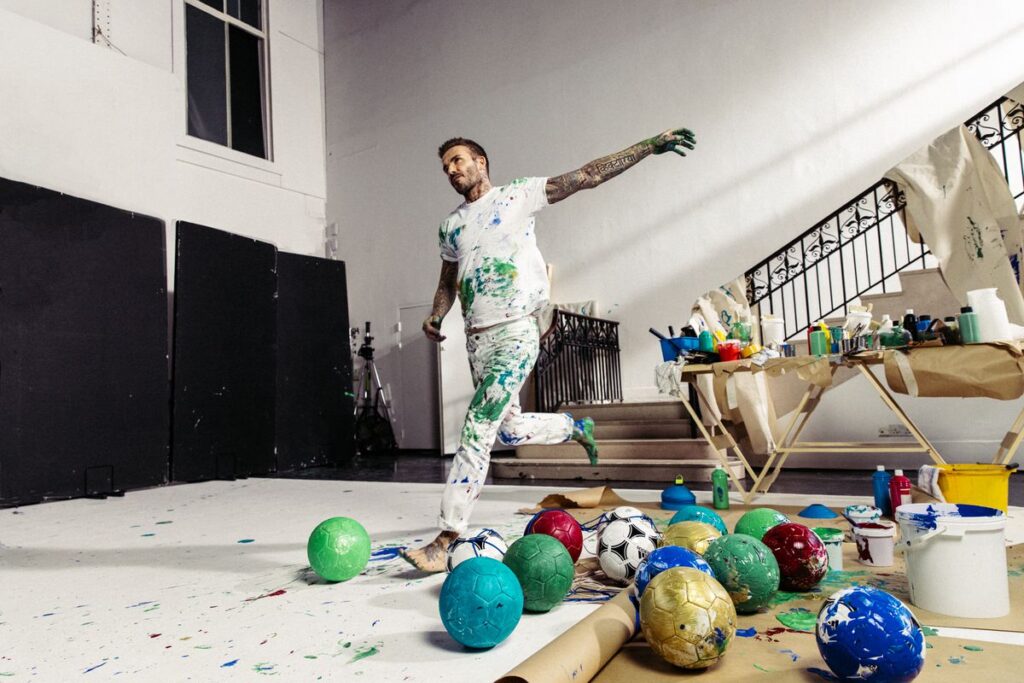 En su cuenta de Instagram, Beckham se muestra con el torso desnudo, confundiéndose sobre su piel tattoos y gotitas de pigmento: el dibujo de Victoria Beckham rodeada de estrellas y la leyenda en hebreo “yo soy de mi amada, mi amada es mía”. David golpea unos cuantos balones seguidos hasta el definitivo, que cubre antes con el pigmento de los dioses, el oro, y servirá para coronar la imagen de lo que creíamos era una action painting pero que al final es —¡oh, no!— una vulgar y predecible representación de un árbol de Navidad.