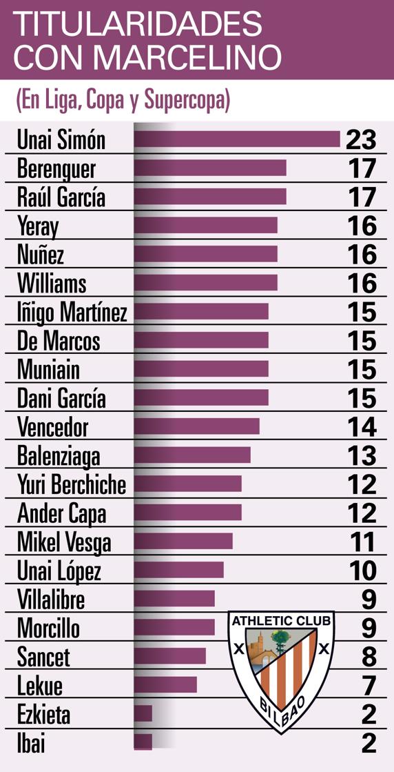 García lo han hecho en 17 contabilizando las tres competiciones que ha disputado el conjunto bilbaíno de enero en adelante. Con 16 titularidades están Yeray, Nuñez e Iñaki
