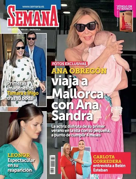 En Semana, Ana Obregón acapara la parte central de la portada, con las imágenes de la presentadora llegando a Mallorca para disfrutar del primer verano con su nieta, Ana Sandra, que está a punto de cumplir cuatro meses. La revista ofrece también las mejores fotografías de la reaparición de la Princesa Leonor con sus padres y su hermana, la infanta Sofía, en Gerona, en la entrega de los Premios de la Fundación Princesa de Gerona, ñas primeras imágenes de Tamara Falcó e Íñigo Onieva el día después de su boda, ya convertidos en marido y mujer y una entrevista de Carlota Corredera a Belén Esteban tras el reciente final de Sálvame.
