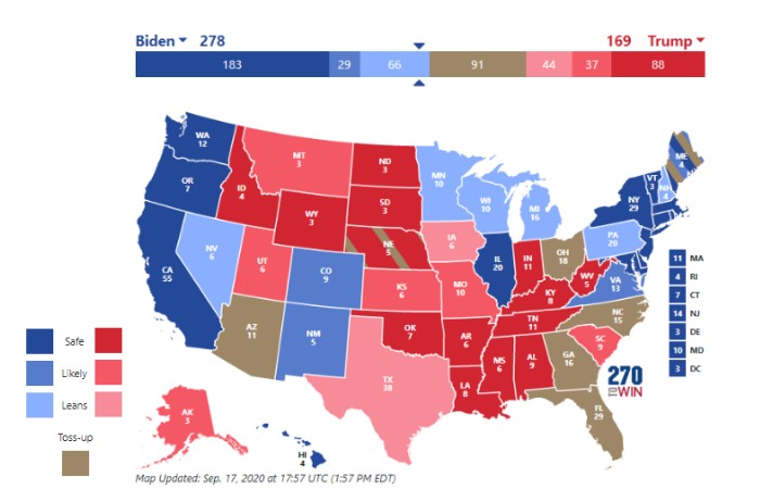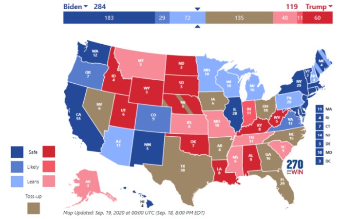 Sobre la base anterior, se presentan los datos a la fecha de corte que dan ventaja a Biden (18 de septiembre de 2020) en los siguientes términos: 138 votos electorales seguros, 29 probables y 72 inclinados a votar por el Partido Demócrata. Sin necesidad de sumar a los electores en los estados reñidos, esto le da un total de 284 electores, lo cual le proporciona la victoria. A Trump sólo le aseguran 119 electores: 60 seguros, 11 probables y 48 inclinados a votar por él, dándole sólo 119 votos electorales.