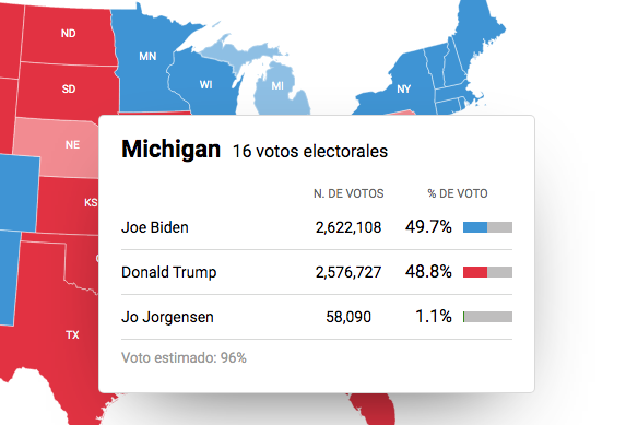 Actualmente, en Michigan va arriba Biden con el 96% de voto estimado: