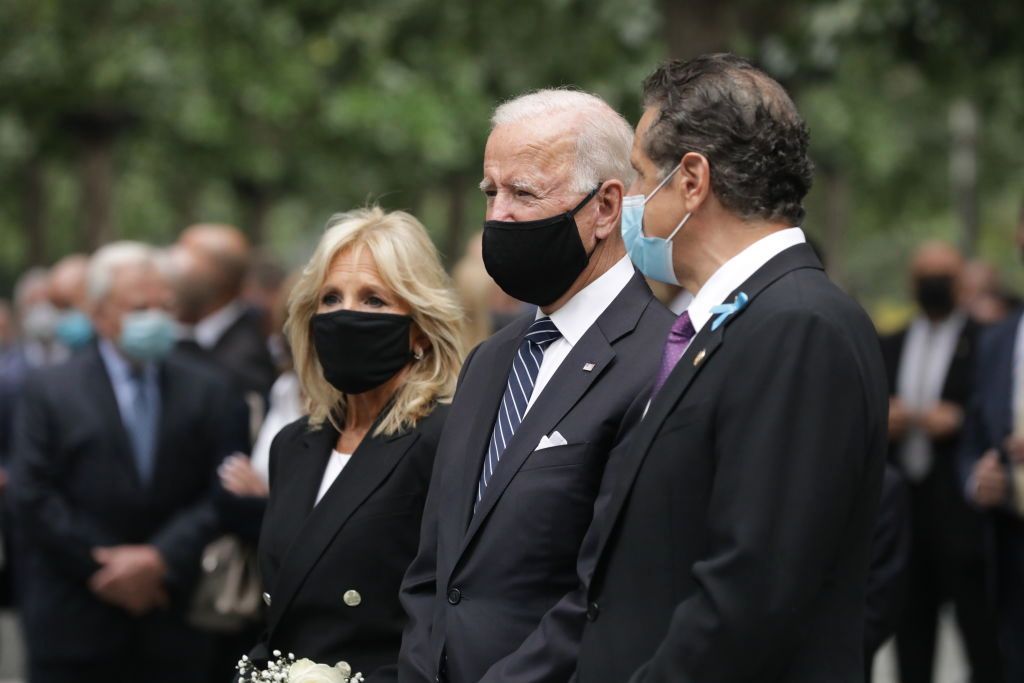El candidato presidencial demócrata Joe Biden (centro), la Dra. Jill Biden (izquierda) y el gobernador de Nueva York Andrew Cuomo (derecha) asisten al servicio conmemorativo del 11 de septiembre en el Museo y Monumento Nacional del 11 de septiembre el 11 de septiembre del 2020 en la ciudad de Nueva York .