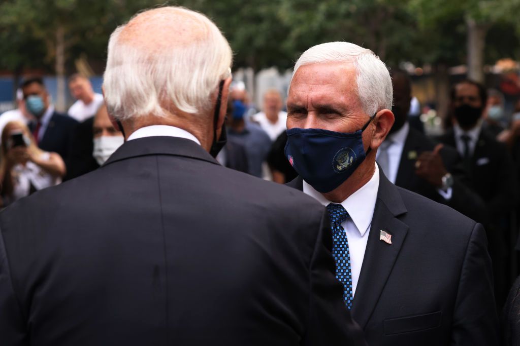 El candidato presidencial demócrata y exvicepresidente Joe Biden y el vicepresidente Mike Pence conversan durante el servicio conmemorativo del 11 de septiembre en el Museo y Monumento Nacional del 11 de septiembre el 11 de septiembre de 2020 en la ciudad de Nueva York.