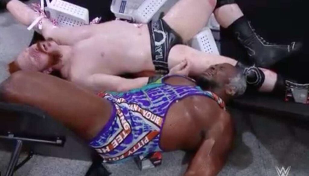 Pelearon entre bastidores, lo adivinaste, el área de catering. Siempre en espera cada vez que un combate de la WWE pasa entre bastidores. Big E terminó cubierto de comida cuando Sheamus lo arrastró por el pasillo. Sheamus estaba a punto de golpear a Big E con una pantalla plana, pero E tomó una escoba y comenzó a golpearlo con ella. Siguió con algunas inyecciones en el bote de basura.