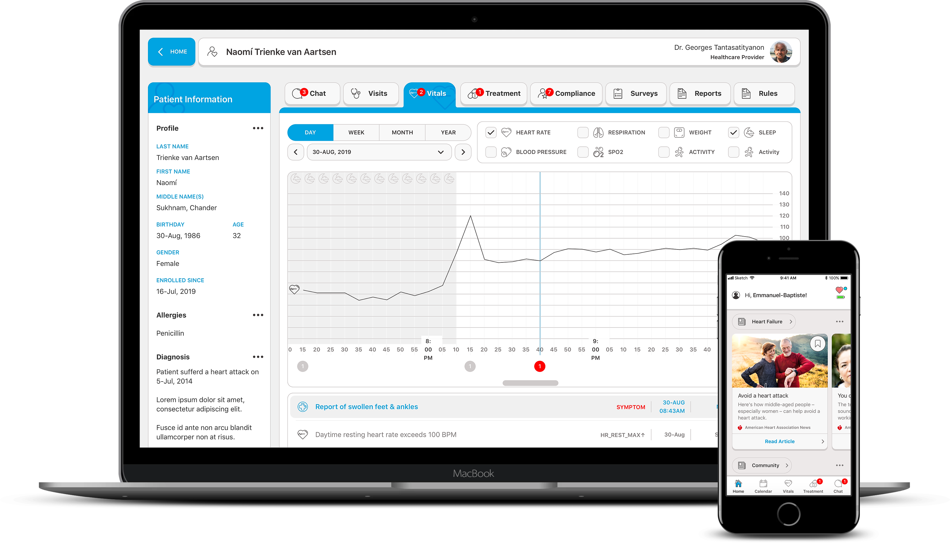 Con ese segmento de pacientes, la plataforma Biofourmis utiliza una combinación de datos de sensores (sensores médicos en lugar de dispositivos portátiles de uso que se usan las 24 horas del día, los 7 días de la semana) y su tecnología para monitorear la salud del paciente, detectar problemas con anticipación y prescribir un curso de tratamiento óptimo . Esa información se difunde a través de aplicaciones móviles complementarias para pacientes y cuidadores.