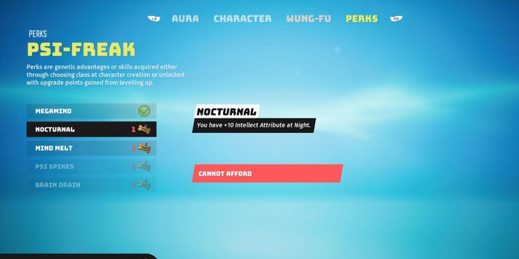 Todas estas ventajas son una obviedad y deben invertirse tan pronto como el jugador pueda. Si valdría la pena omitir alguno, sería Nocturnal. Sin embargo, esto aún puede ser un beneficio extremadamente útil, ya que los jugadores pueden ir a las áreas de descanso durante el día y elegir dormir hasta el anochecer. El intelecto es el atributo que afecta directamente el Ki del jugador, lo que lo hace bastante valioso para el Psi-Freak.