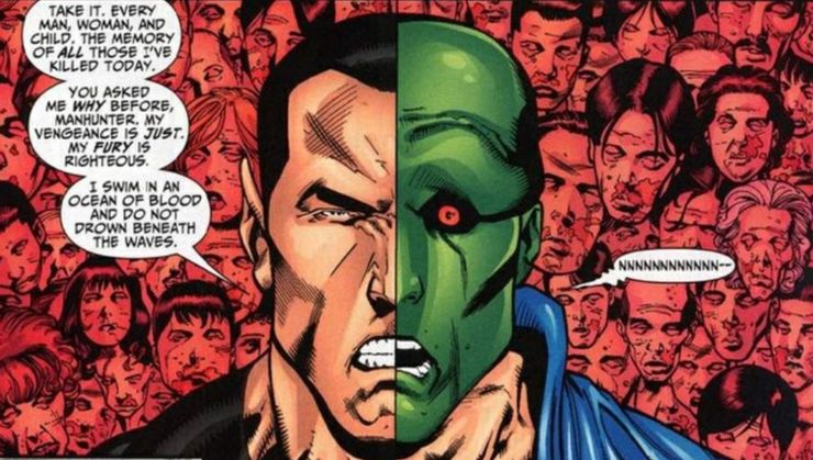 Sin arrepentirse de sus fechorías, Adam usa sus recuerdos contra Manhunter y le dice: “Nado en un océano de sangre y no me ahogo bajo las olas” y haciendo que el héroe destrozado huya en Tercera Guerra Mundial: Libro Uno – Un Llamado a las Armas por Keith Champagne y Pat Olliffe. Problemas más tarde, Manhunter regresa con un ataque telepático propio, armando su trauma mucho más profundo de la pérdida de su mundo contra su enemigo. Pero mientras Black Adam es derrotado, esta experiencia traumática y su breve conexión con Black Adam deja a J’onn cambiado, contribuyendo parcialmente a su perspectiva más alienígena y alienada presente en DC. Un año después relanzar.