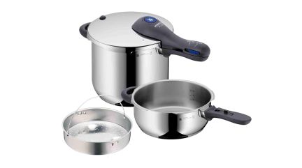 HOGAR | Los básicos de cocina nunca están de más en el hogar y si se pueden conseguir de rebaja, mucho mejor. Es el caso de este juego de ollas express rápidas de WMF que puedes comprar por tan solo 139,99 euros. Se trata de un set de tres piezas: una olla de 6,5 litros de capacidad, otra de 3 litros y un recipiente para poder separar los alimentos en dos niveles de cocción. Se puede utilizar en todo tipo de cocinas. 22% de descuento, ahorra 39 euros.