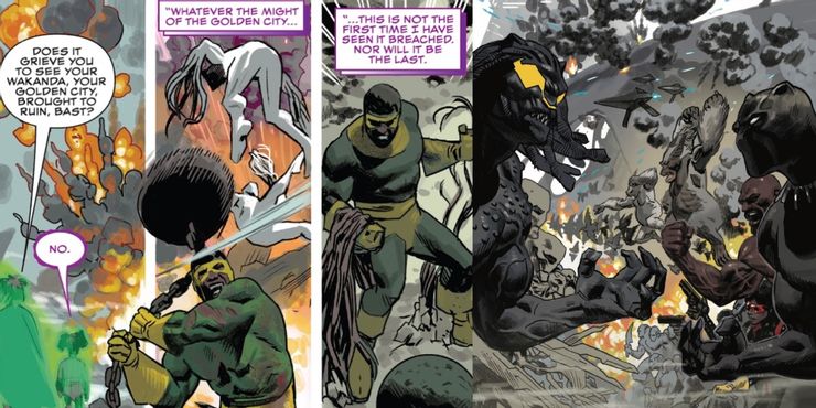 Bast continúa explicando que puede soportar las ruinas porque las ha forjado y ha visto la ciudad caer muchas veces antes, como con Thanos en la línea de tiempo anterior durante Guerras secretas o cuando Namor inundó Wakanda durante Vengadores contra X-Men. Es el espíritu de Wakanda que perdura para siempre a pesar de las invasiones, muertes, nuevos gobernantes y cambios en el status quo de lo que Wakanda realmente puede convertirse. Por ejemplo, una vez que Black Panther y sus aliados ganan la batalla, la responsabilidad de liderar el imperio intergaláctico y convertirlo en una fuerza para el bien ahora recae en T’Challa, al ver a Black Panther convertirse en un emperador cósmico (a pesar de su desgana).