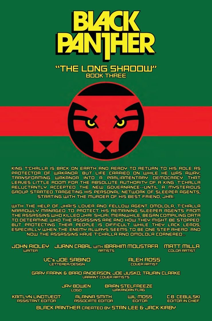 Wakanda es una de las naciones más poderosas del Universo Marvel, gracias en parte a sus enormes reservas del metal precioso vibranium. Esto le ha dado a Wakanda una gran ventaja en el escenario global, incluso cuando el resto del continente africano estaba siendo devastado por el colonialismo y la trata de esclavos. Recientemente, el gobernante de Wakanda, Black Panther, convirtió el país en una democracia, abdicando del dominio absoluto que una vez tuvo sobre él. También se reveló que, años antes, Black Panther envió agentes durmientes de Wakandan al mundo para salvaguardar los intereses del país. Ahora, alguien ha comenzado a apuntar a estos agentes. Black Panther ahora debe rastrear a quien sea que esté detrás de estos asesinatos, todo mientras intenta mantener en secreto la existencia de los agentes. Mientras tanto, la corrupción se está extendiendo en Wakanda. El número de tamaño gigante está escrito por John Ridley, con arte de Juann Cabal e Ibrahim Moustafa, coloreado por Matt Milla y rotulado por Joe Sabino.