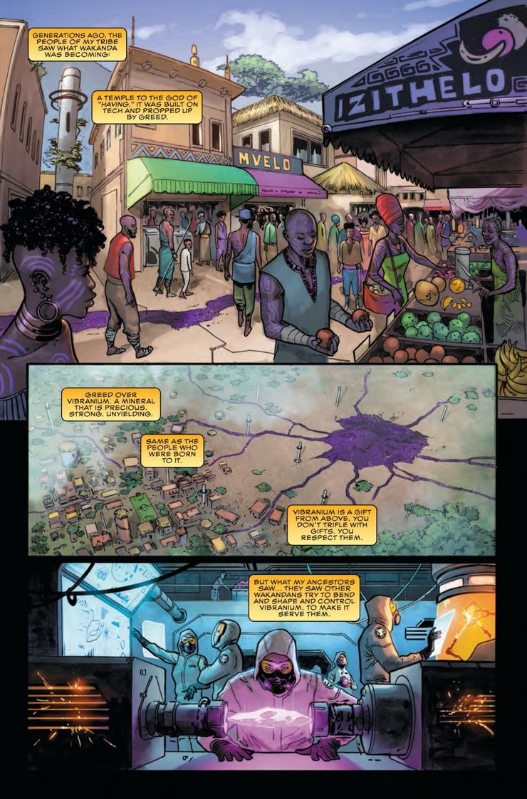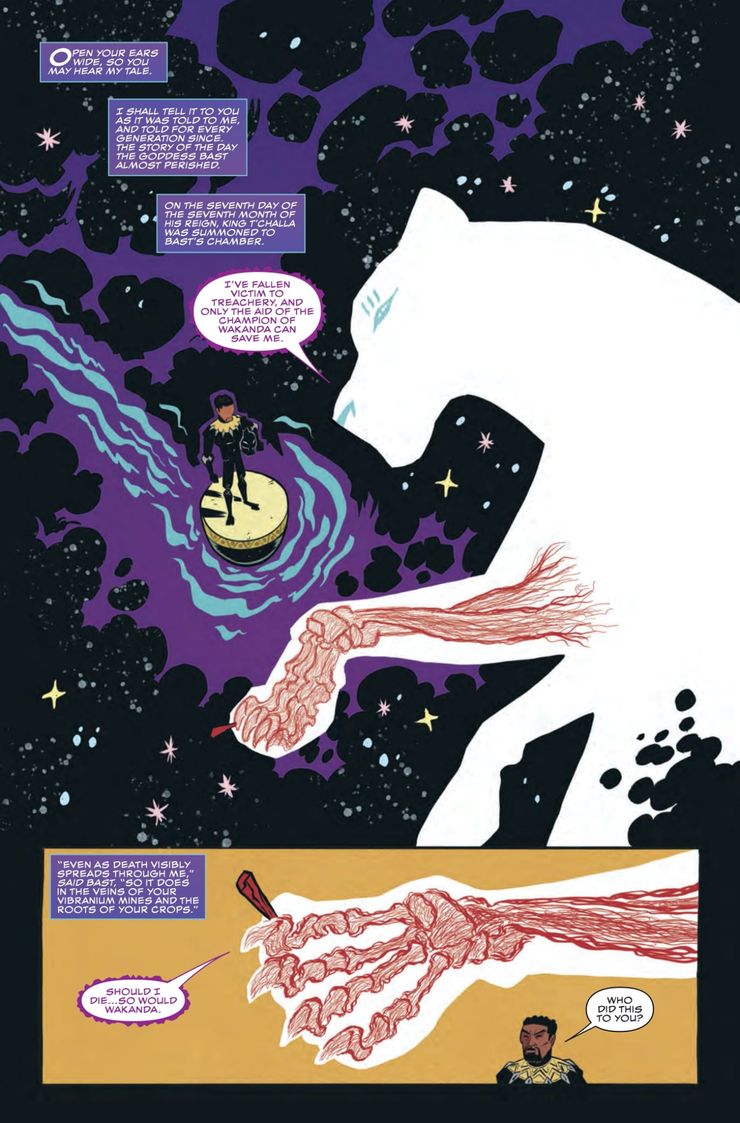 Cuando se abre la vista previa, Black Panther está consultando con Bast, el guardián del Panther Clan. Ella le dice a Black Panther que tiene “caído víctima de la traicióny solo él puede salvarla. Bast le dice a Panther que lo que sea que la está matando se ha extendido a las minas de vibranium, así como a los cultivos de la nación. Ella concluye diciendo “Si yo muero… también lo haría Wakanda”. La vista previa cambia de enfoque, y un narrador anónimo describe la codicia y la corrupción que se está extendiendo a través de Wakanda, y regresa a las reservas de vibranio de la nación. A medida que el narrador relata esto, los lectores ven escenas de riqueza y opulencia de Wakanda.