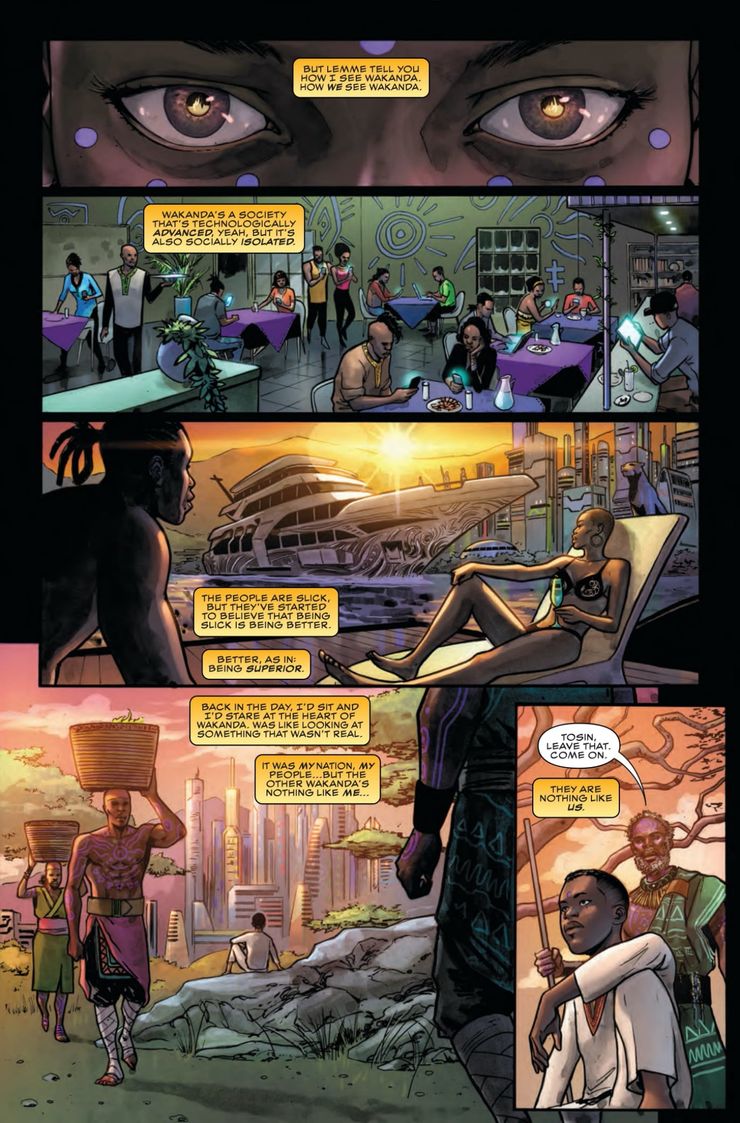 El narrador parece ser Tosin Oduye, un nuevo héroe de Wakanda provocado por Marvel que evita el desarrollo tecnológico de Wakanda y puede que no le guste T’Challa. Si bien Oduye aparentemente será una presencia heroica en los cómics, sigue siendo posible que sea responsable de los ataques a los agentes durmientes de Black Panther. Cualquiera que sea el responsable de los ataques también puede resentir que Black Panther cambie el gobierno tradicional del país a una democracia. la nación de Wakanda ha sido vista como un paraíso incorruptible, pero no todos están de acuerdo, y ahora recae sobre Pantera negra para hacer frente a los crecientes disturbios en su país.