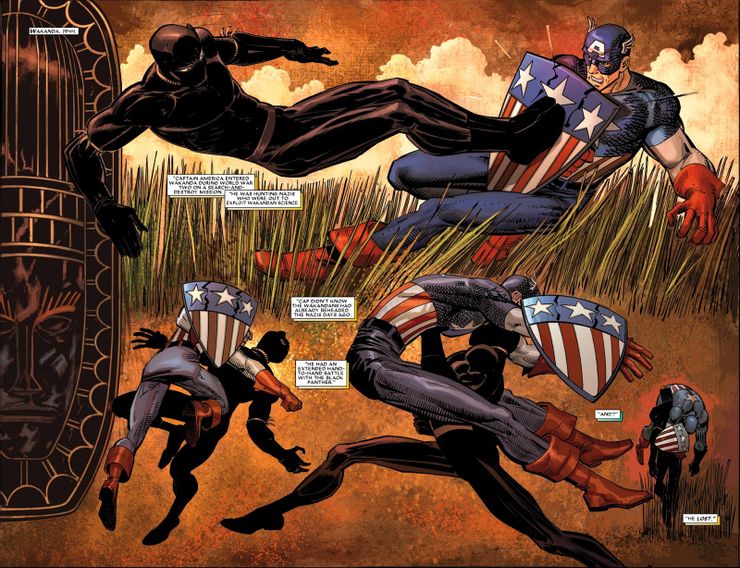 En Pantera Negra # 2, El Capitán América fue enviado en una misión a Wakanda en 1944 para perseguir a los espías nazis que robarían la tecnología de Wakanda. Sin que él lo supiera, Wakanda había atrapado y decapitado a los espías días atrás. Cuando el Capitán América invadió suelo de Wakanda, se encontró con la Pantera Negra de la época … y perdió. Por supuesto, este era el Capitán América al comienzo de su carrera sin su escudo Vibranium (y Black Panther era Azzuri, abuelo de T’Challa), pero esta pelea era una señal de lo que vendría.