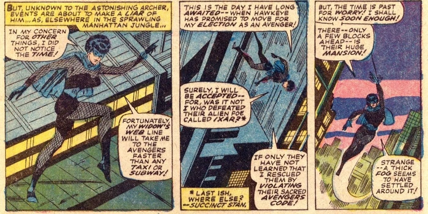Natasha Romanoff, también conocida como Black Widow, es una conocida súper espía en Marvel Comics, pero originalmente era una heroína que estaba mucho más en línea con la ‘Familia Spider’ no oficial. Aparte del nombre ‘Black Widow’ en sí, Natasha también solía tener un dispositivo estilo Spider-Man llamado Widow’s Web, que le permitía literalmente moverse por la ciudad de Nueva York. Este dispositivo se mostró de manera destacada en Vengadores #38, y si bien ha usado diferentes formas de tirolinas y repelentes desde entonces, nunca han estado tan de marca como la Widow’s Web original de esos cómics de la generación anterior.