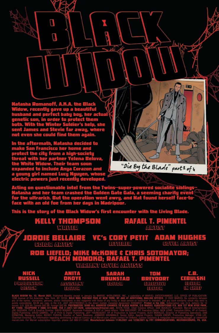 The Living Blade es la última incorporación al mito de la Viuda Negra, aunque tiene profundos lazos con su pasado. El año pasado, Black Widow finalmente tuvo todo lo que pensó que quería: una familia, con un esposo e hijo amorosos y una vida en los suburbios. Todo era una mentira, orquestada por algunos de sus peores enemigos, y la pérdida la afectó profundamente. Buscando dejar atrás el pasado, Black Widow se mudó a San Francisco, con su compañera Yelana Bolova. Allí, los dos han comenzado a construir su propio equipo, agregando a la ex Spider-Girl Anya Corazon a las filas. En el número anterior, el equipo, buscando derribar a las hermanas superpoderosas de la alta sociedad, las Gemelas, se infiltró en un evento de la alta sociedad y, durante el transcurso de los eventos, se encuentra con Living Blade. Si bien el último número fue la primera vez que los lectores conocieron a Living Blade, Black Widow tiene una gran historia con Blade y cuenta en una vista previa de Viuda Negra # 13. El número está escrito por Kelly Thompson, ilustrado por Rafael T. Pimentel, colores de Jordie Bellaire y letras de Cory Petit, con portada de Adam Hughes.