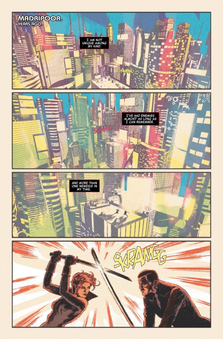 La vista previa, contada completamente en flashback, comienza en la nación insular de Madripoor, famosa en el Universo Marvel por su corrupción y vicio. Black Widow, con uno de sus trajes clásicos, persigue a Living Blade a través del horizonte de Madripoor. Los dos están peleando con espadas, y justo cuando Black Widow cree que tiene la ventaja en la pelea, se da cuenta de que Living Blade realmente la cortó. Ella continúa su persecución, enfrentando al Blade una vez más, pero está claro que la ventaja ha cambiado a su favor. Mientras tanto, Black Widow reflexiona sobre sus enemigos y sobre cómo hay algunos que se meten debajo de la piel, y el primero de ellos para ella fue Living Blade.