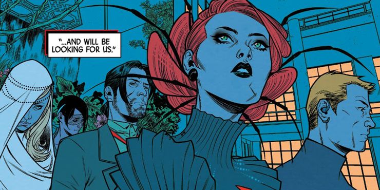 En Viuda negra # 12 de Kelly Thomspon, Elena Casagrande, Elisabetta D’Amico, Jordie Bellaire y Cory Petit de VC, los seis héroes llegan a la Golden Gate Gala, donde Natasha usa un vestido impresionante, con un fascinador apropiado en forma de ventana. Mientras tanto, Clint Barton no rehuye su experiencia como arquero, ya que luce un tabardo de alta costura. Con todo, los héroes se ven absolutamente fabulosos. Mientras Nat, Clint, Bucky y Yelena exploran la pista de baile, Anya y Lucy descubren a la alta sociedad subastando animales exóticos en secreto.