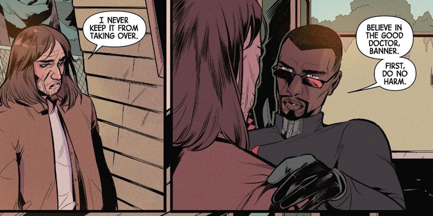 El momento confirma que Blade puede hacer exactamente lo que Hulk no puede. Tanto Hulk como Bruce Banner han expresado su deseo de tomar el control total de su cuerpo compartido, pero ninguno puede evitar que el otro tome el control. Blade, sin embargo, parece dominar su cuerpo con facilidad mientras está poseído. Ambos son personajes sorprendentemente similares con temperamentos similares, pero CuchillaLa ira le permite protegerse de visitantes corporales no deseados. Casco No puedo decir lo mismo, y eso podría mantenerlos a él y a Bruce Banner unidos el uno al otro para siempre.