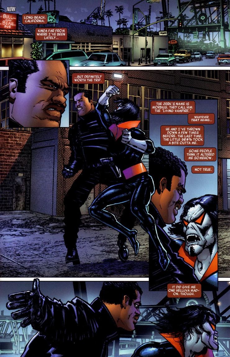 En 1999 Peter Parker: Hombre Araña # 8, que debutó aproximadamente un año después de la película, Blade está cazando a Morbius, y cuando lo encuentra, es mordido. Curiosamente, la mordedura es solo una pequeña parte de la trama y es casi intrascendente en la historia más amplia. Más tarde ese año, en Blade: Cazador de vampiros n. ° 1, se reveló que la mordedura hizo tienen un efecto en Blade, mutándolo y dándole poderes como los que tenía en la película, como velocidad y superfuerza. A partir de entonces, el cómic Blade se parecía mucho más a la versión cinematográfica. Sin embargo, Marvel más tarde decidió ignorar por completo la explicación de Morbius. En 2006, Blade recibió una serie, una que modificó aún más su origen. En el primer número, los lectores ven a la madre de Blade, trabajando en un burdel, atacada por el vampiro Deacon Frost mientras da a luz. Sin embargo, la implicación aquí es que fue el mordisco de Frost, no el de Morbius, lo que le dio a Blade sus poderes. Esto se confirmó más tarde en el número cinco cuando Blade dijo que sus poderes no se derivaban de Morbius, sino que provenían de Deacon Frost.