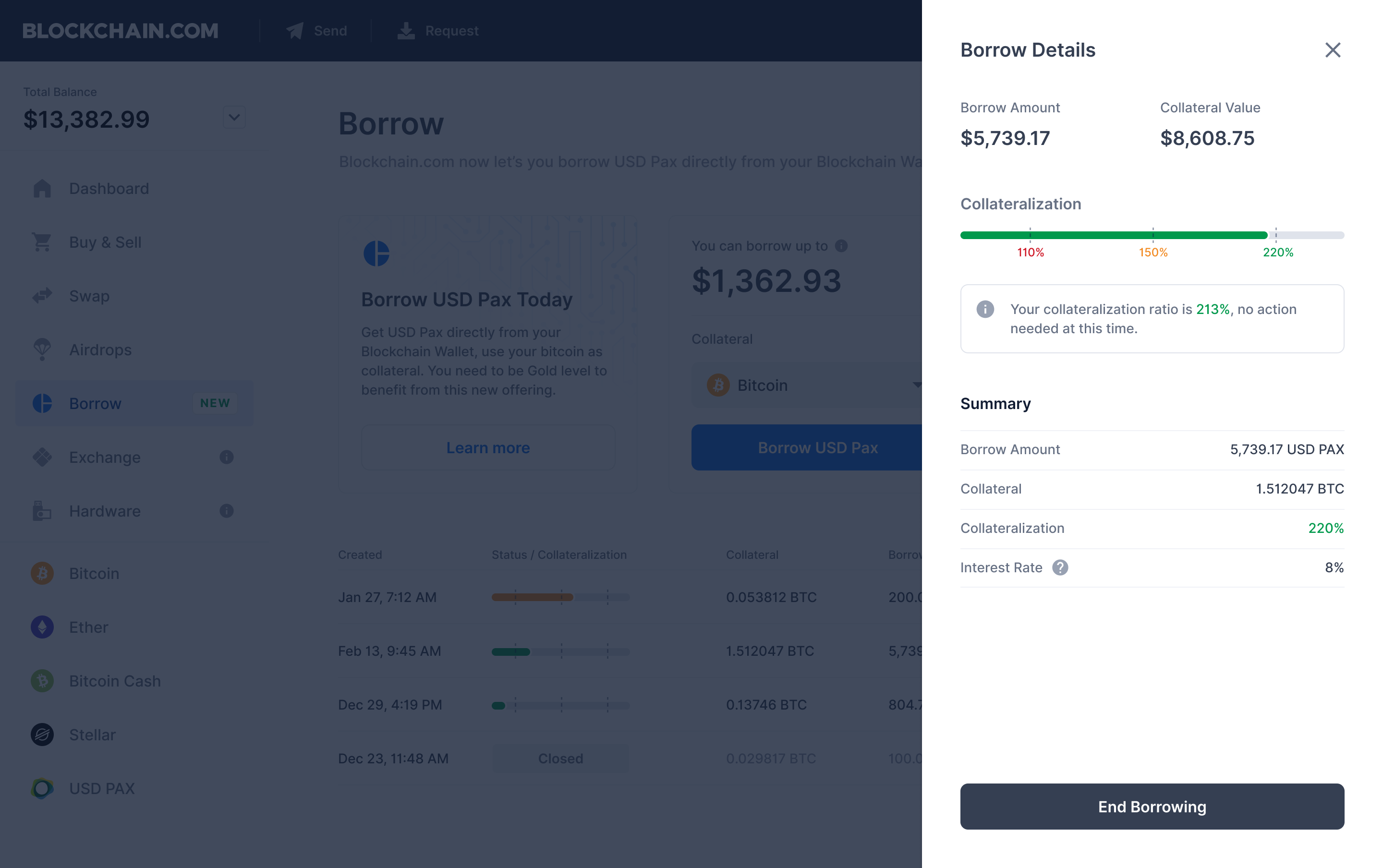 El monto mínimo del préstamo es de $ 1,000 y Blockchain requiere un índice de colateralización del 200%. Significa que si desea pedir prestados $ 5,000, debe depositar el equivalente de $ 10,000 en criptomonedas como garantía.