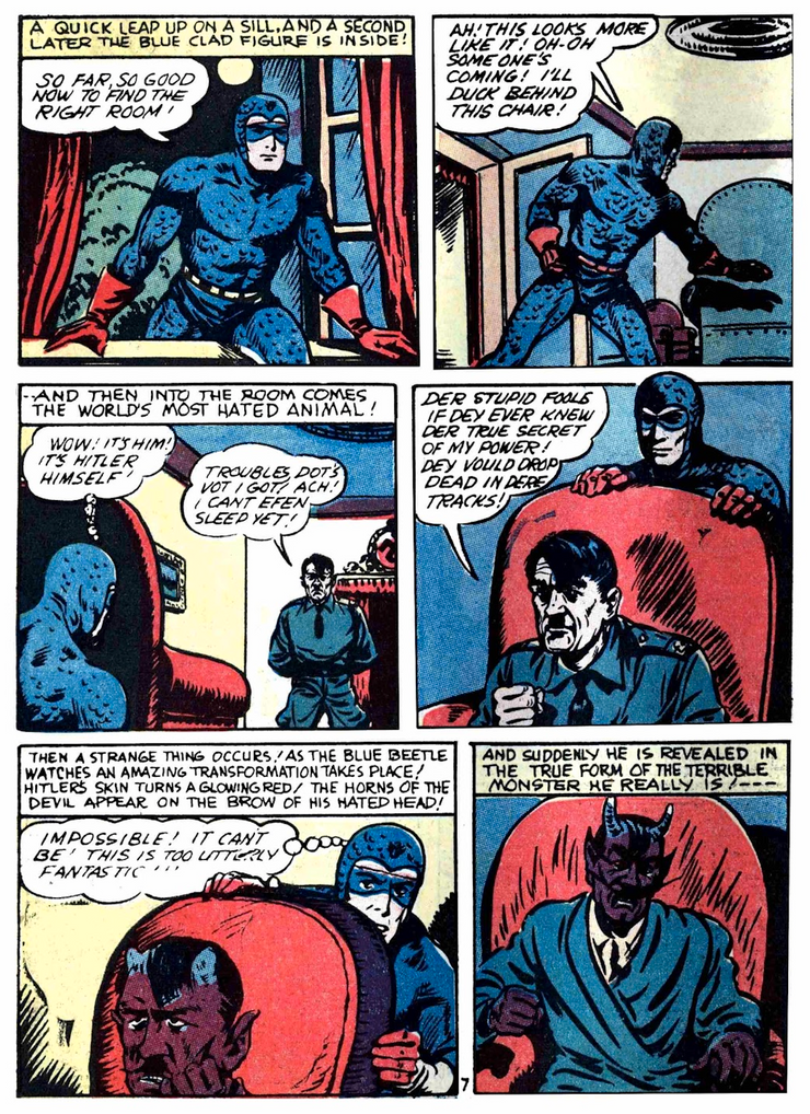 En Escarabajo azul #22, el Escarabajo de la Edad de Oro (Dan Garrett) se embarca en una misión a la Alemania nazi y se encuentra en un cuartel general nazi. Al aventurarse en el interior, se da cuenta de que está en la propia morada de Hitler, y lo que ve lo aturde. El rostro de Hitler comienza a transformarse ante sus propios ojos; su piel se vuelve de un rojo oscuro y le crecen grandes cuernos en la frente. “¡Imposible!” piensa Garret. “¡No puede ser! ¡Esto es absolutamente fantástico!” Tanto Garrett como el lector son testigos del cambio de forma del rostro de Hitler en el mismísimo Diablo.