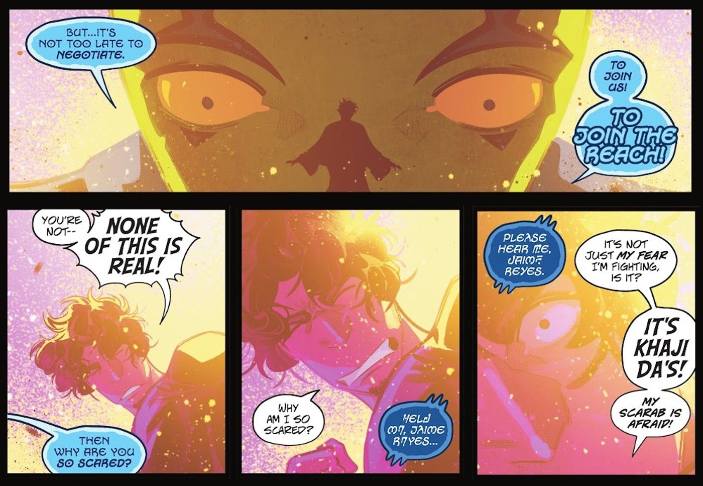 Blue Beetle obtiene su actualización de armadura sorpresa (y emocional) en Escarabajo azul: día de graduación #5 por Josh Trujillo, Adrián Gutiérrez, Wil Quintana y Lucas Gattoni. Después de ser noqueado en una batalla con algunos miembros bien intencionados de la Liga de la Justicia, Jaime comienza a comprender que los problemas que ha tenido para comprender a Khaji Da, su escarabajo, están relacionados con el miedo que ambos sienten por el futuro de Jaime. Una vez que Jaime reconcilia su miedo, los dos regresan más fuertes que nunca.