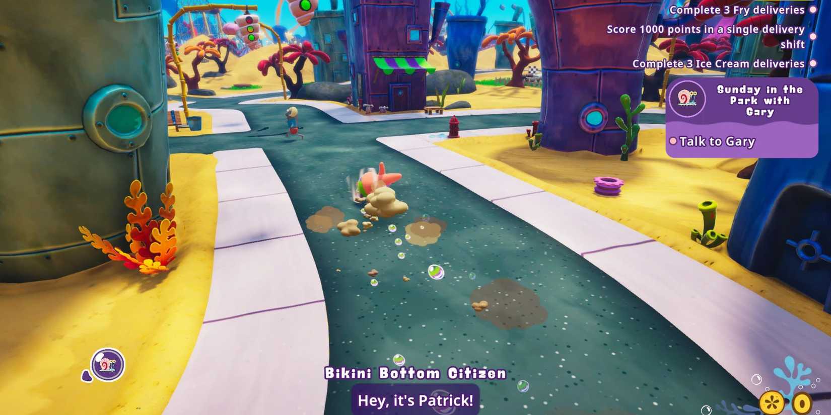 La mayor parte del tiempo que jugué, no usé esta función de rodar, sino que elegí caminar o conducir cualquiera de los autos disponibles para que Patrick saltara y controlara. El aspecto de la física también entra en juego en muchos de los minijuegos, como montar medusas o conducir vehículos de reparto a clientes hambrientos. Hay muchos elementos que Patrick puede equipar. que utilizan muchas de las físicas del juego, como intentar volar por el aire con algunas alas y estrellarse impotente contra el suelo.