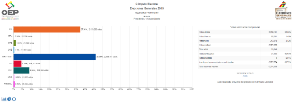 Tras denunciar un intento de fraude por parte del Tribunal Supremo Electoral a favor del presidente, el candidato opositor Carlos Mesa, con el apoyo de movimiento sociales contrarios a Morales, advirtió que no reconocerá una victoria de su contrincante en primera vuelta y se movilizará para forzar una segunda.