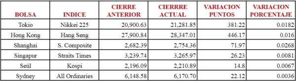 A continuación el cierre de los principales mercados de la región Asia-Pacífico: